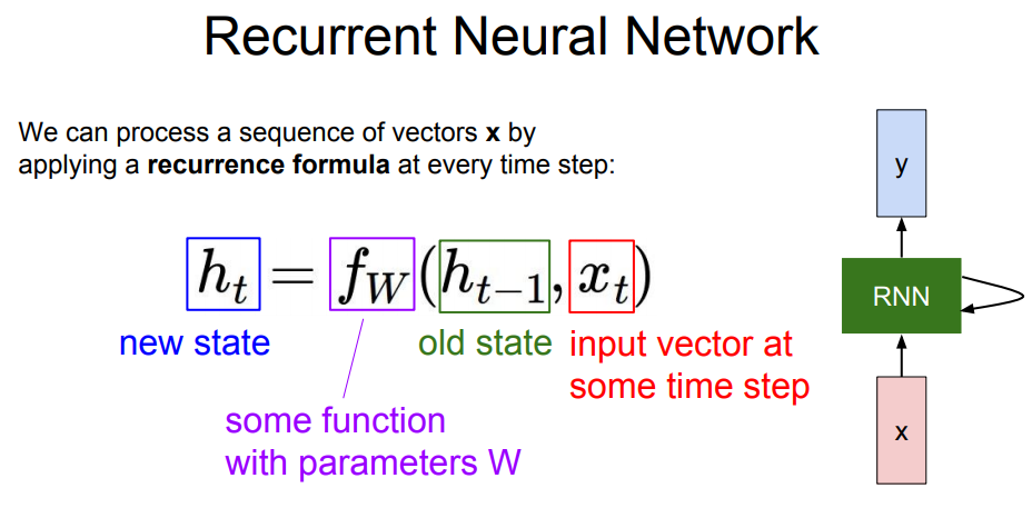 위의 그림에서는 RNN의 기본적인 원리에 대해서 설명하고 있습니다. 보시는 것처럼 RNN은 모든 time step에서 재귀식/점화식(recurrence formula)을 적용해서 작동하게 됩니다. 점화식(recurrence formula)은 이웃하는 두개의 항 사이에 성립하는 관계를 나타낸 식을 말합니다.