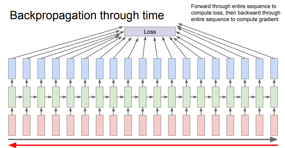 RNN에서도 CNN과 동일하게 성능 개선을 위해 backpropagation으로 weight를 업데이트 하게 됩니다. 이때, 위와 같은 흐름으로 진행이 됩니다.