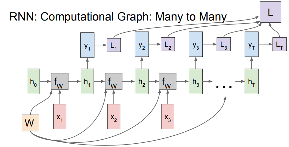 위의 그림은 Many to many의 경우에 해당되는 계산 그래프(Computational Graph)입니다. 위의 흐름처럼 계산이 되고, 각 타임 스탭에서 생성된 loss들의 합이 RNN 전체의 loss값이 됩니다.