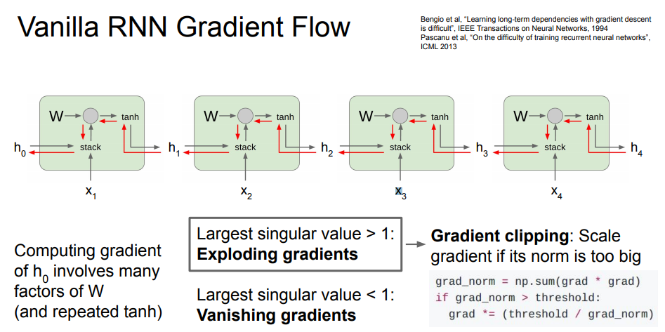 위의 그림처럼 똑같은 RNN이 계속 이어져있는 상황에서 2가지 문제가 발생하게 됩니다. 가장 먼저 RNN을 통해 backward pass 과정에서 weight의 일부 값과 곱해지는 상황이 생기게 되는 데, 이 중 동일한 RNN을 거치면서 수많은 가중치 행렬과 곱셈이 이뤄지게 됩니다. 여기서 가중치 행렬의 값 중 가장 큰 것이 1보다 크다면, loss값이 exploding 하는 현상을 만들게 됩니다. 이 문제는 우측에 보이는 것처럼 Gradient clipping으로 막을 수 있습니다. 하지만, 가장 큰 값이 1보다 작게 된다면, 가중치 행렬에 의해 점점 작아져서 0이 됩니다. 이와 같은 vanishing gradient 문제는 다른 구조의 RNN을 사용하는 것 밖에는 막을 수 있는 방법이 없습니다. 그래서 이를 보완하고자 나온 것이 LSTM이라는 방법입니다.