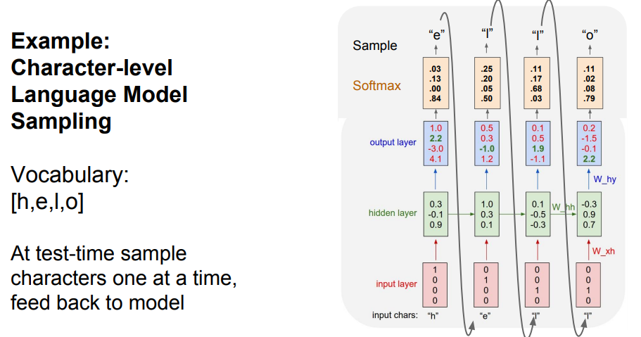 위의 그림은 "hello"라는 sequence data를 주고, 정답을 찾을 수 있는 지 확인하는 예시입니다. 여기서 저희가 사용할 알파벳은 4개이므로, 4개를 각각 원-핫 인코딩을 통해 벡터화해서 Vocabulary에 저장했습니다. 그리고 input으로는 "h"를 넣었을 때에는 "e"가 출력되고, "e"를 입력으로 넣었을 때에는 "l"이 출력되도록 만듭니다. 위의 예시는 Vanilla RNN이므로 tanh함수를 활용했습니다. 최종 결과 쪽을 보시면, 이상한 것을 알 수 있습니다. "e"는 [0,1,0,0]이지만, output layer에서는 [1, 2.2, -3, 4.1]로 4.1이 가장 큰 값인 것을 확인할 수 있습니다. 하지만, 가장 큰 값을 출력하는 것이 아닌 샘플링을 통해서 값을 출력하게 됩니다. 때로는 argmax가 좋을 때가 있지만, 샘플링을 통해 모델에서 다양성을 얻을 수 있다는 장점이 있습니다. 예를 들면, "e"가 나오면 무조건 "l"이 아닐 수도 있습니다. 이처럼, 다양성을 위해 샘플링으로 최종 값을 출력합니다.