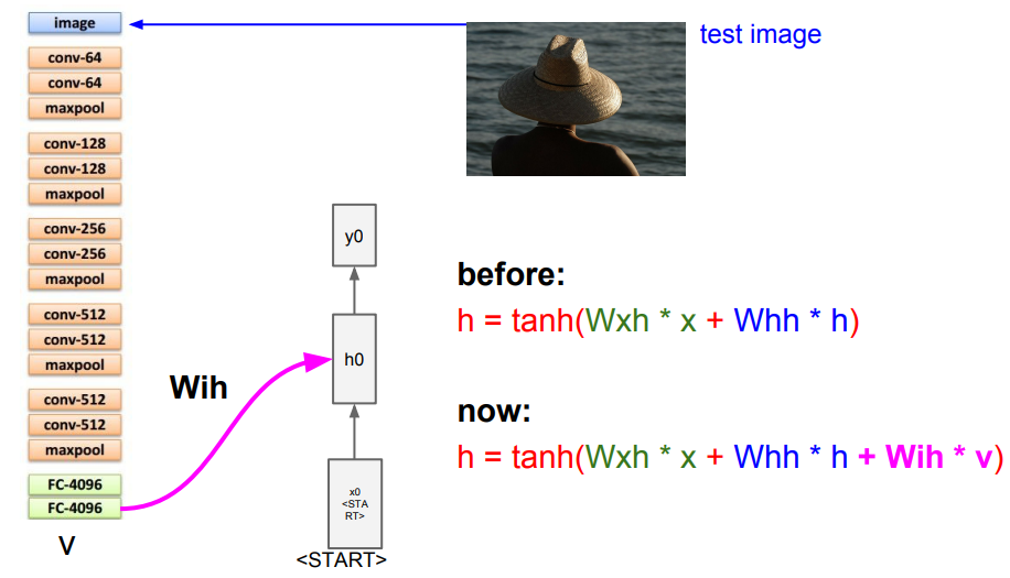 (3) 받은 값을 기존 Vanilla RNN식에 추가하여 계산하게 됩니다. 처음 x0값은 START라는 토큰 값이 주어지게 되고, 모든 단어를 RNN을 통해 출력합니다.